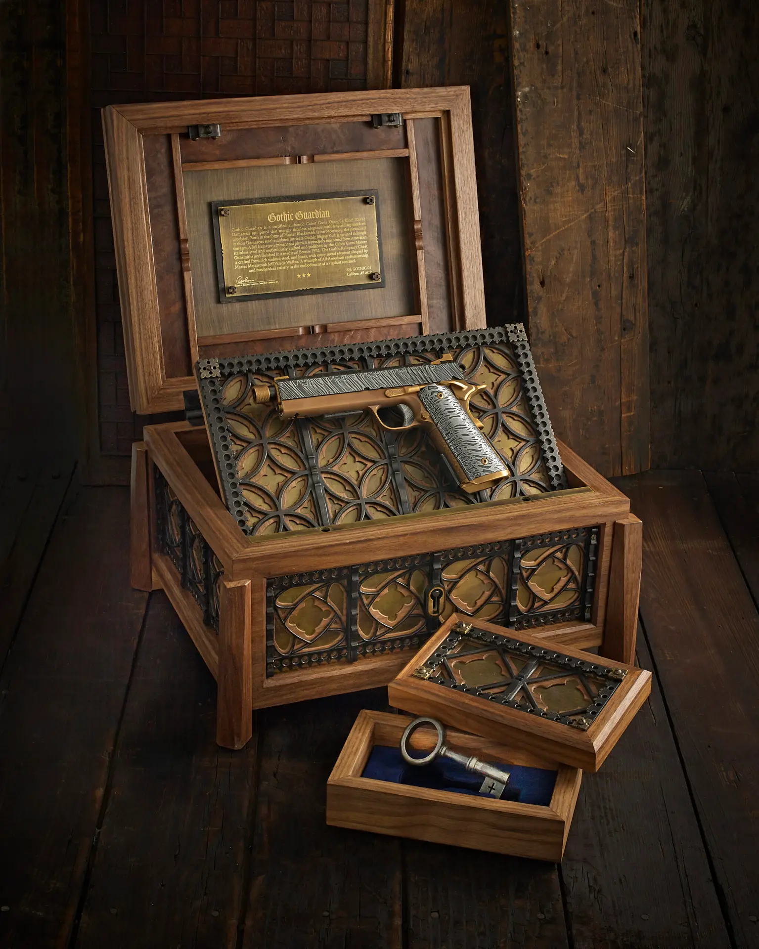 Gothic Guardian is a one-of-a-Kind Cabot 1911. This pistol is complete and ready to ship. $5,000 deposit due at time of ordering, balance due by wire or ACH prior to shipment.