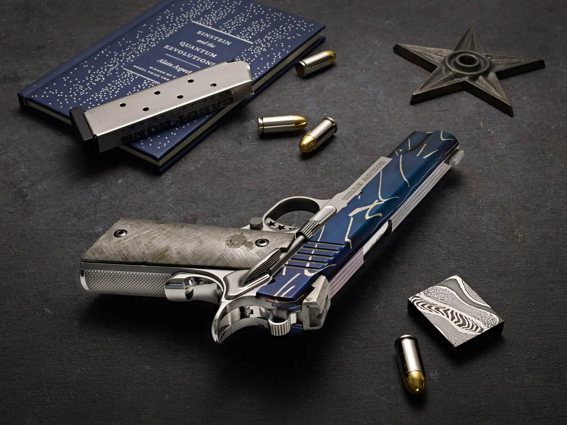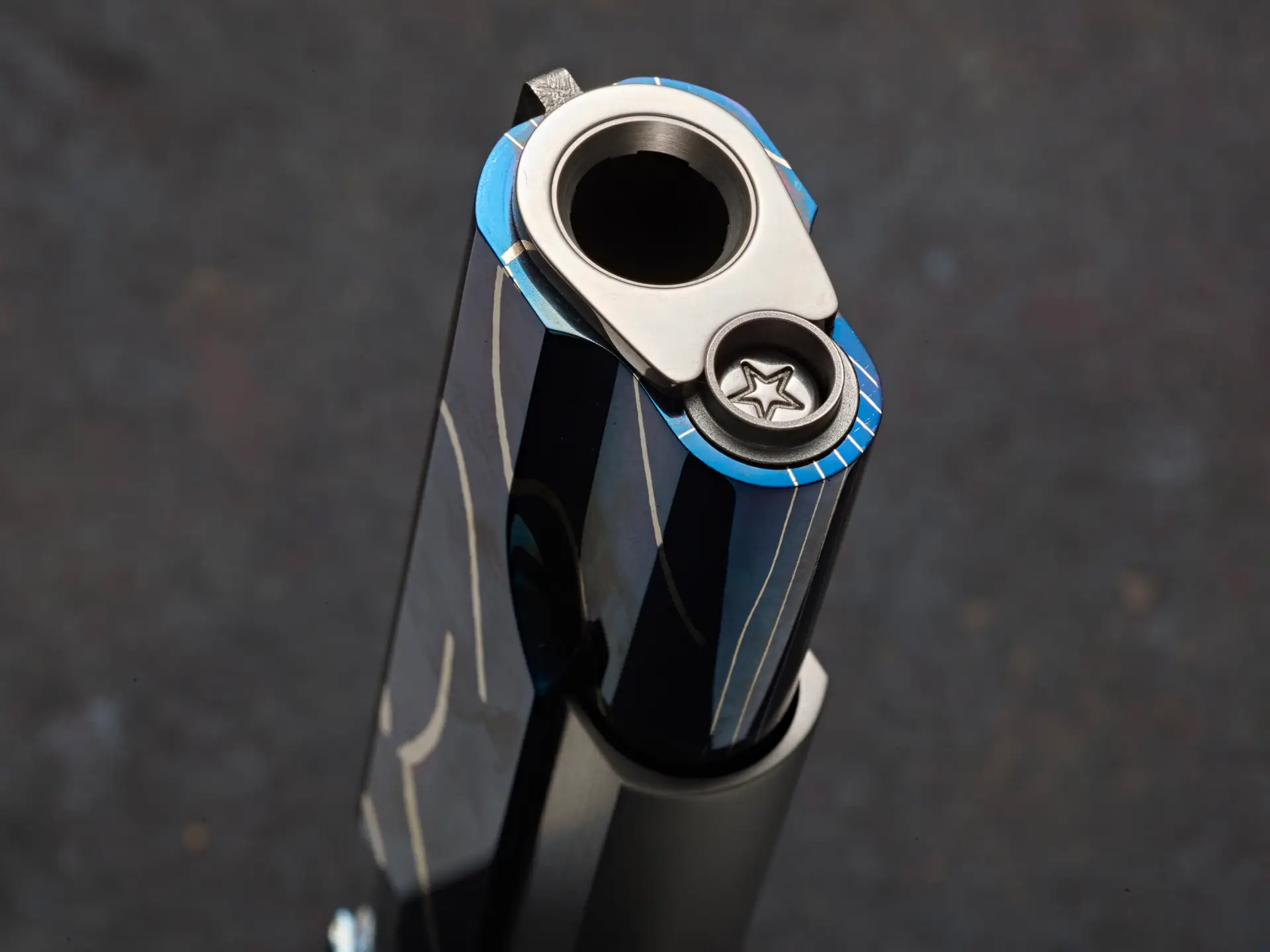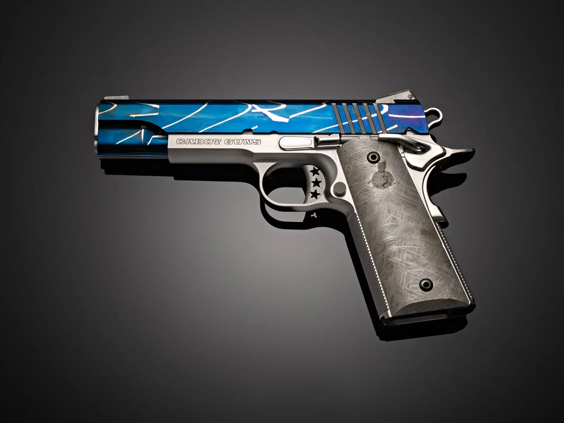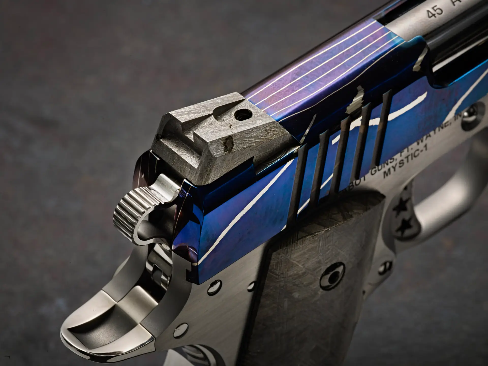 The Damascus slide of Mystic was born in the forge of Master Blacksmith Robert Eggerling with a matrix of steel pierced with bold veins of nickel to represent the brilliant plume of flames as our meteorite flashes though the friction of earth’s atmosphere. Cabot Gun transformed Eggerlings Mystic Damascus steel billet into a highly toleranced and finely functioning pistol through precision machining and master gunsmithing. Finishing of the slide is a meticulously refined bright hand polish and a natural heat coloring technique that brings out the natural colors of the steels with shades of sapphire, cobalt and indigos that replicate the dark mystic night skies.