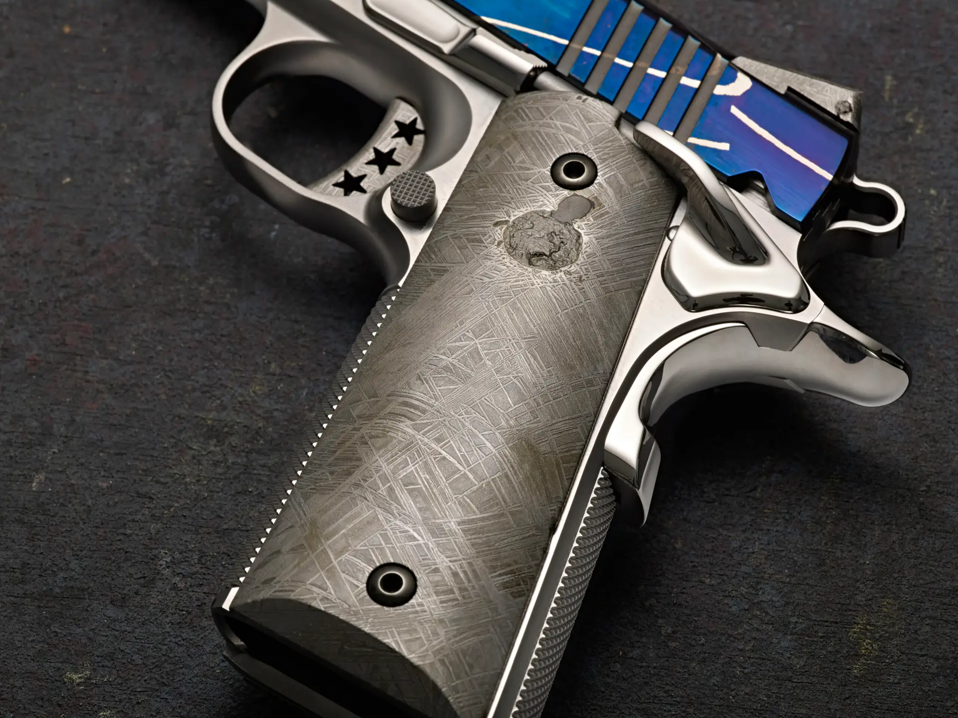 An exceptionally noteworthy element of the meteorite on Mystic is the mineral inclusions, most notably troilite nodules, exhibited on the left grip panel and rear sight. These ancient artifacts formed more than four billion years ago within the molten metallic core of an early asteroid, where iron sulfide separated from iron-nickel metal and solidified into rounded pockets during extremely slow cooling in space. Not defects, but natural features that speak to the meteorite’s cosmic formation, three distinct inclusions are clearly highlighted on the left grip panel and two more are visible on the rear sight. The ponderings of their origin are limitless — what conditions shaped them, and what history do they silently record? They remain preserved within the meteorite as enduring evidence of a journey that poses more questions than answers.