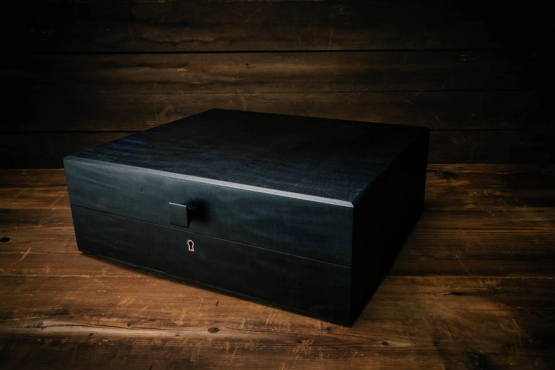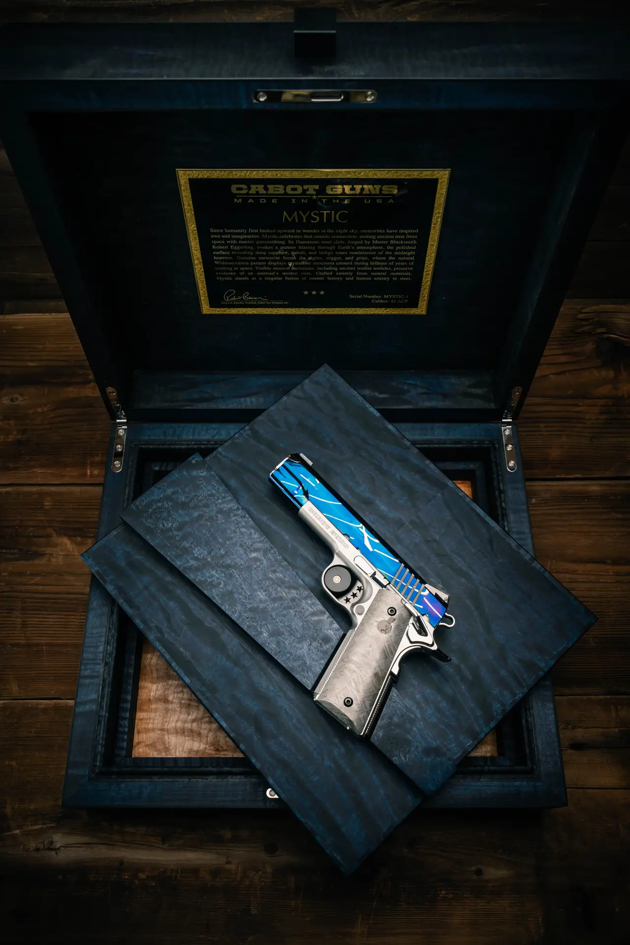 Housed in a museum-grade bespoke case handcrafted by retired nuclear engineer and Master Furniture Guild member Steven A. Parker, the presentation reflects a shared commitment to permanence and craft. Formed from meticulously selected figured wood, the exterior features bookmatched curly maple, hand-dyed in a rich blue to complement the pistol, while a claro walnut interior beneath the removable tray provides elegant contrast. The wood reveals a natural constellation of figure, mirrored with precision to create balance and harmony. Executed in Cabot’s signature Freedom Fit design, the interior presents the pistol with minimal restraint for maximum visibility. An ebony trigger hold adds quiet contrast, and a hand-rubbed oil finish deepens the grain, inviting a tactile connection. Each bespoke Cabot Parker case is serialized—this example being number 67 of all museum-grade cases produced.