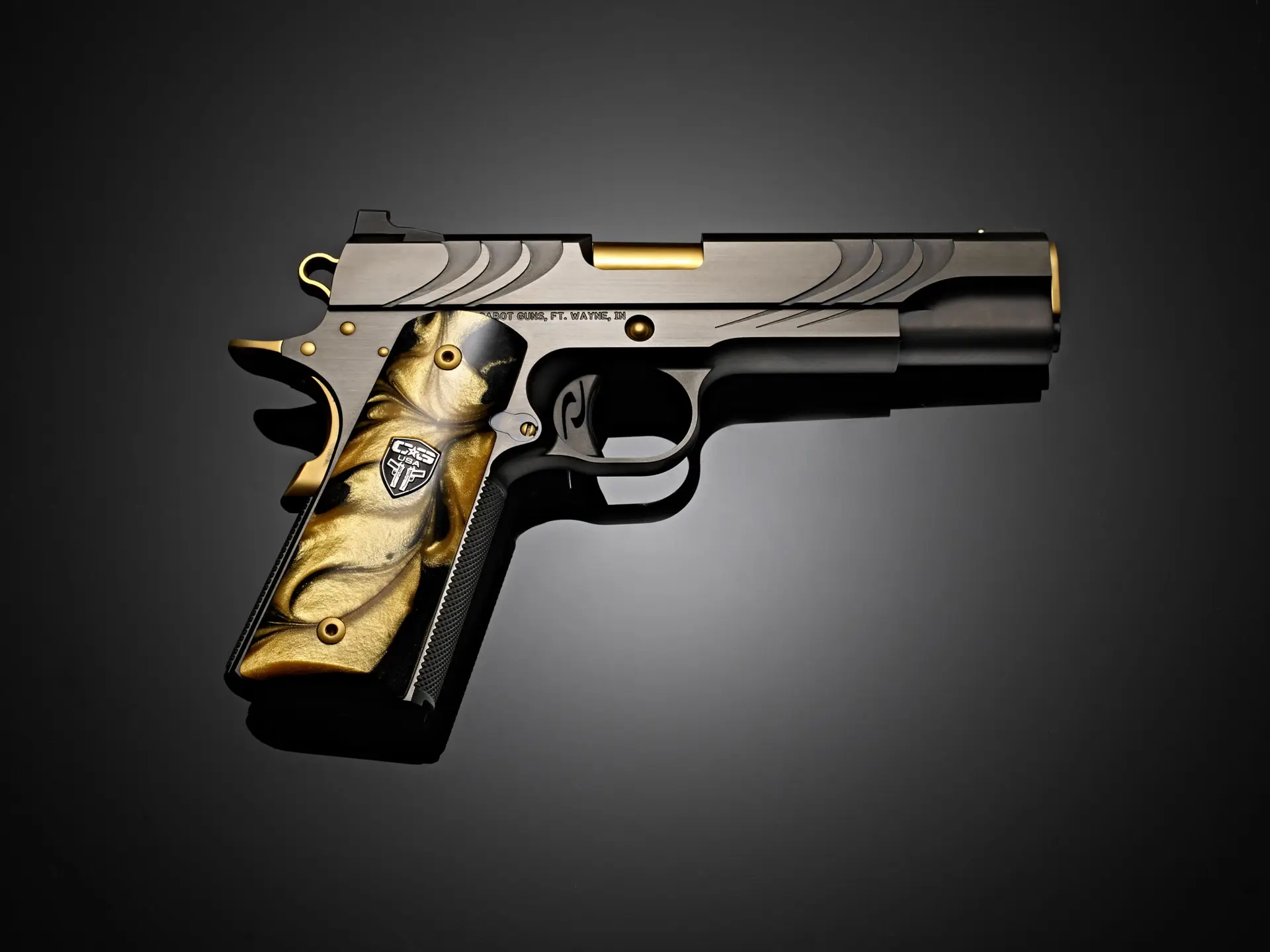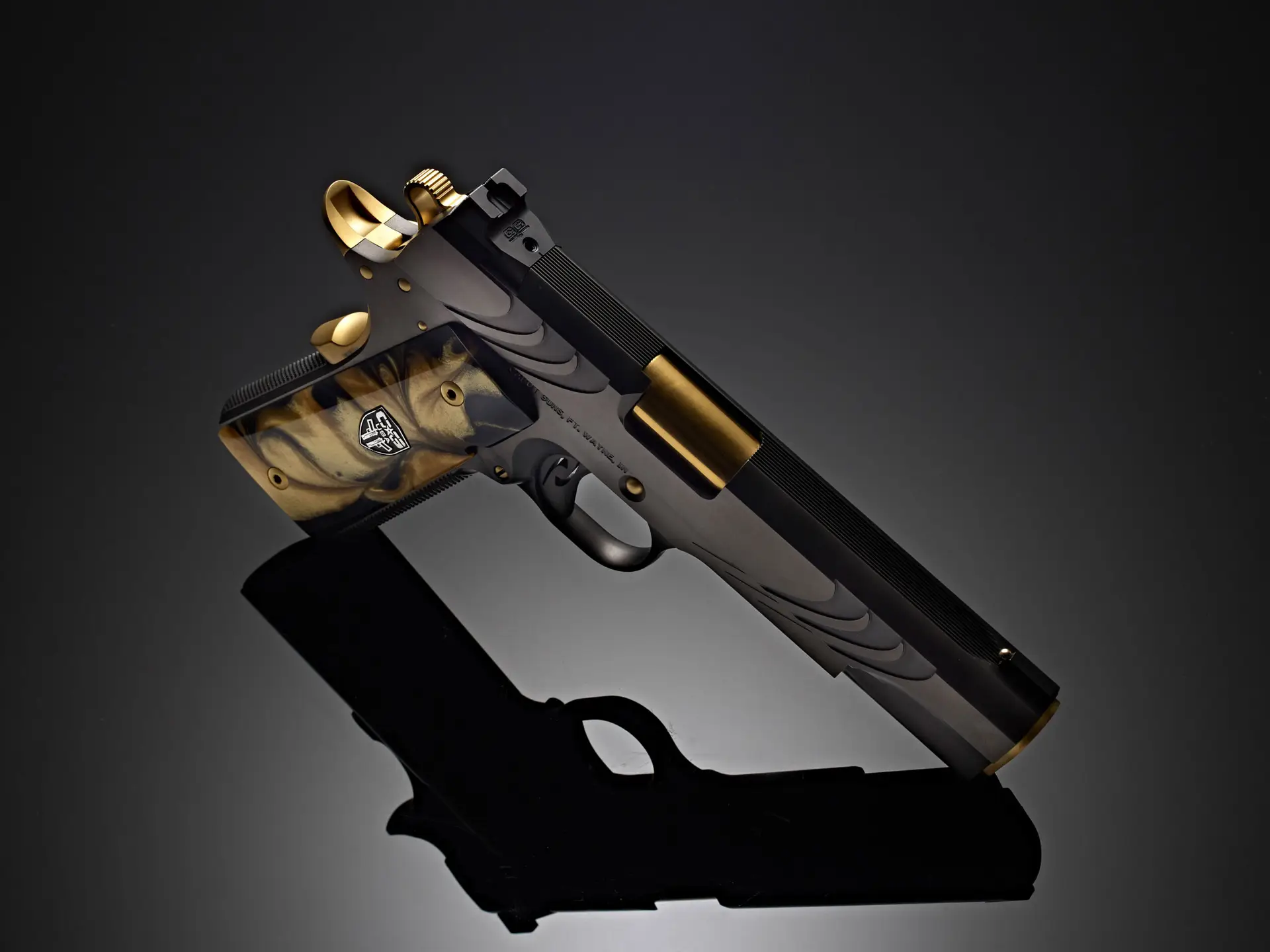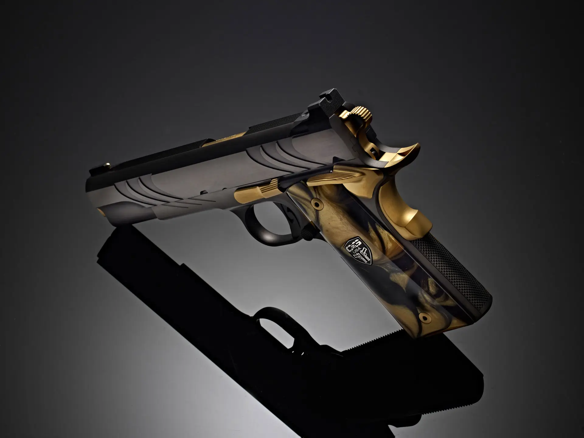 These pistols draw inspiration from dragon lore and the legendary elven-forged swords, such as Naegling, which gleamed in gold and bronze to match the splendor of a golden dragon. They capture that same fierce spirit in every detail. Each 1911 features a sleek black Diamond-Like-Carbon coating applied over hand-polished flats, paired with a golden titanium nitride barrel, bushing, grip safety, hammer, and small parts. The gold-and-black lucite grips, embossed with the Cabot Guns medallion, serve as a perfect shield to complement your sword. They are finished with our exclusive round gold bead front sight, creating a bold and precise aiming point.