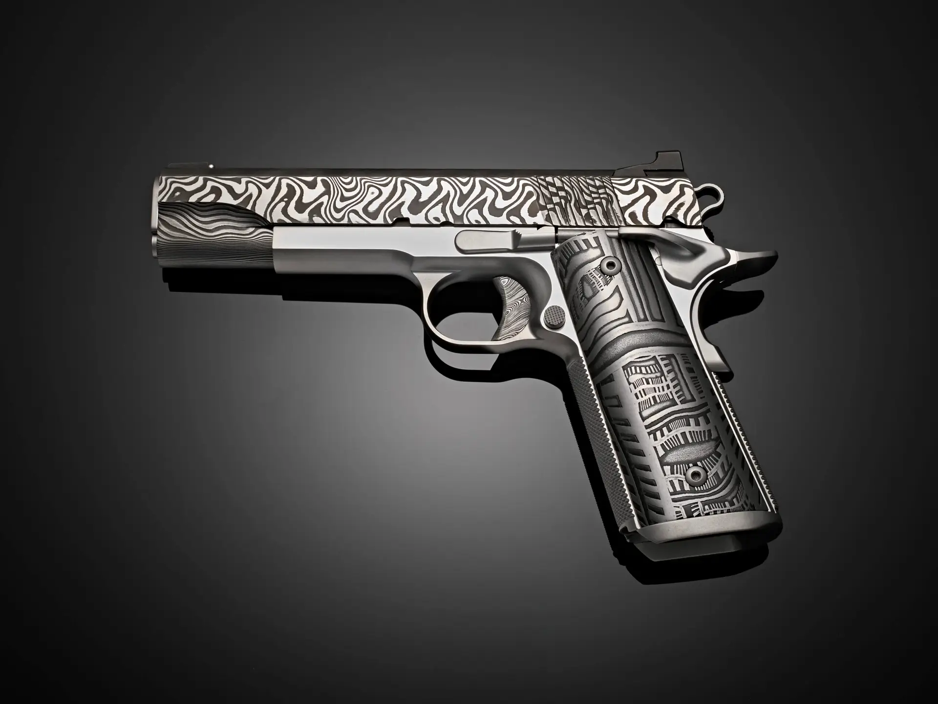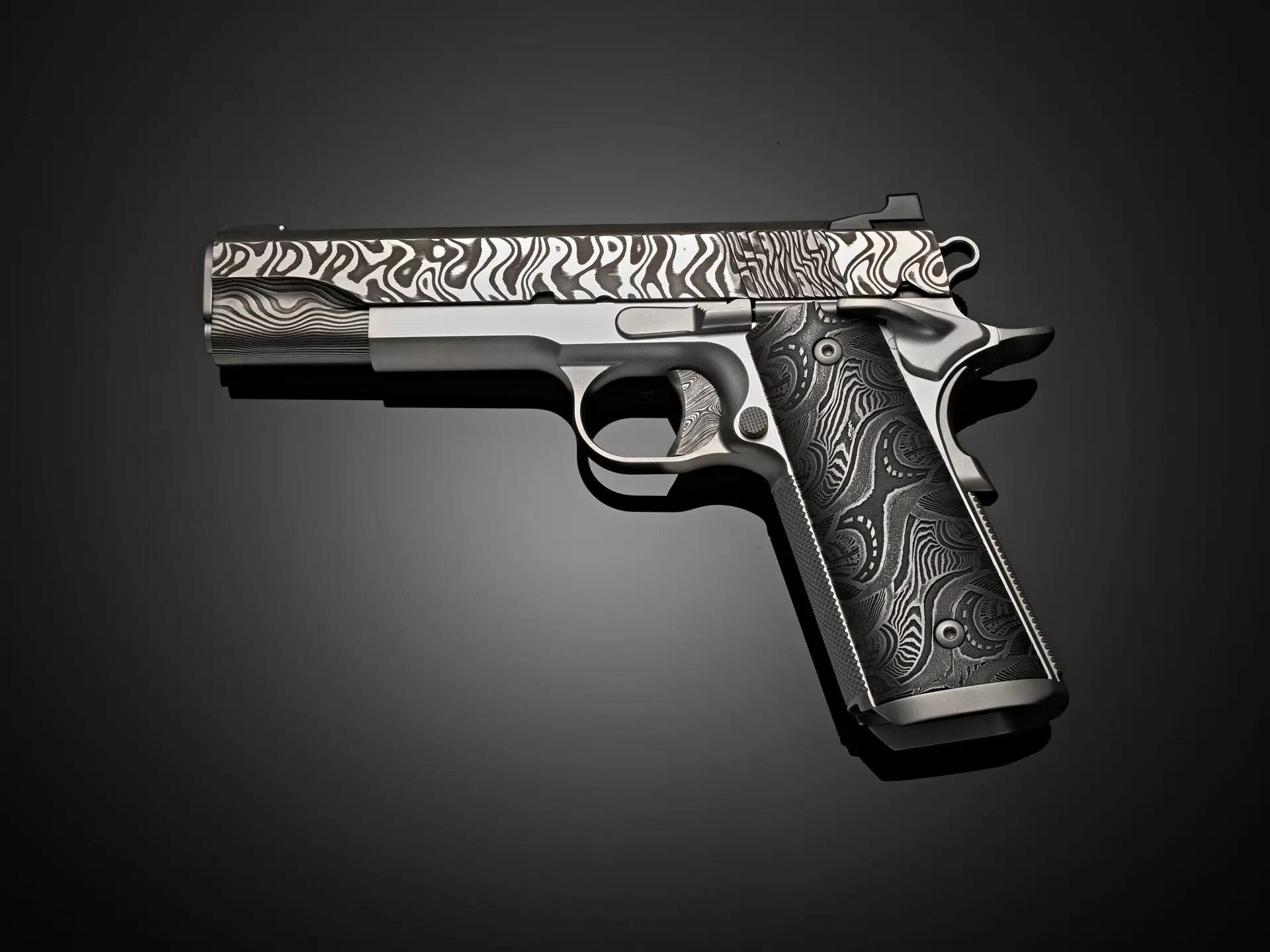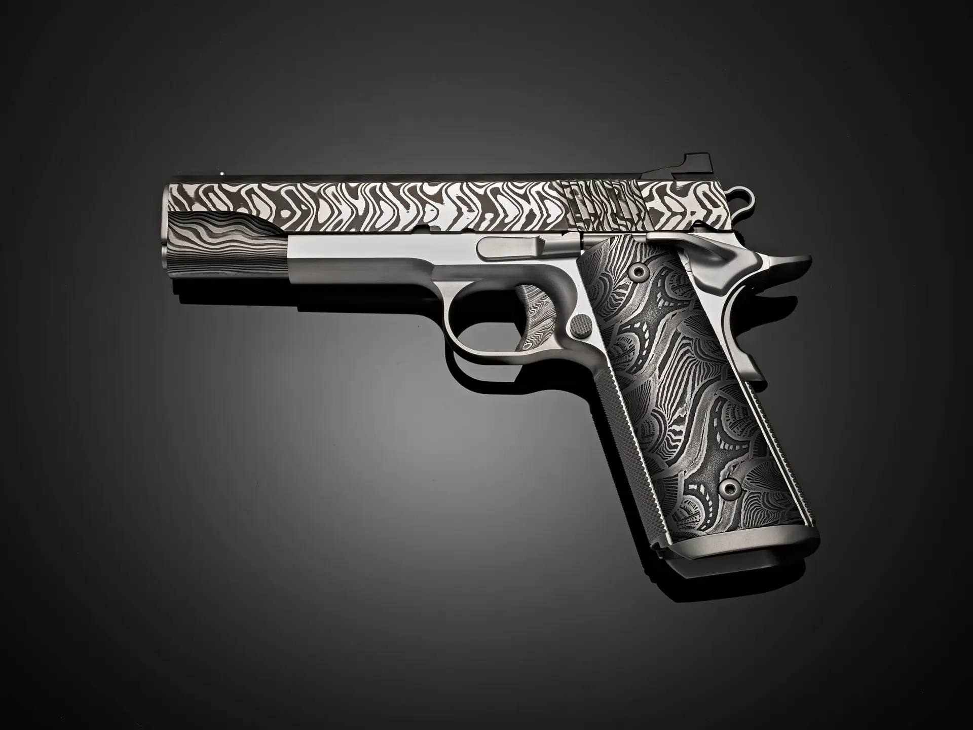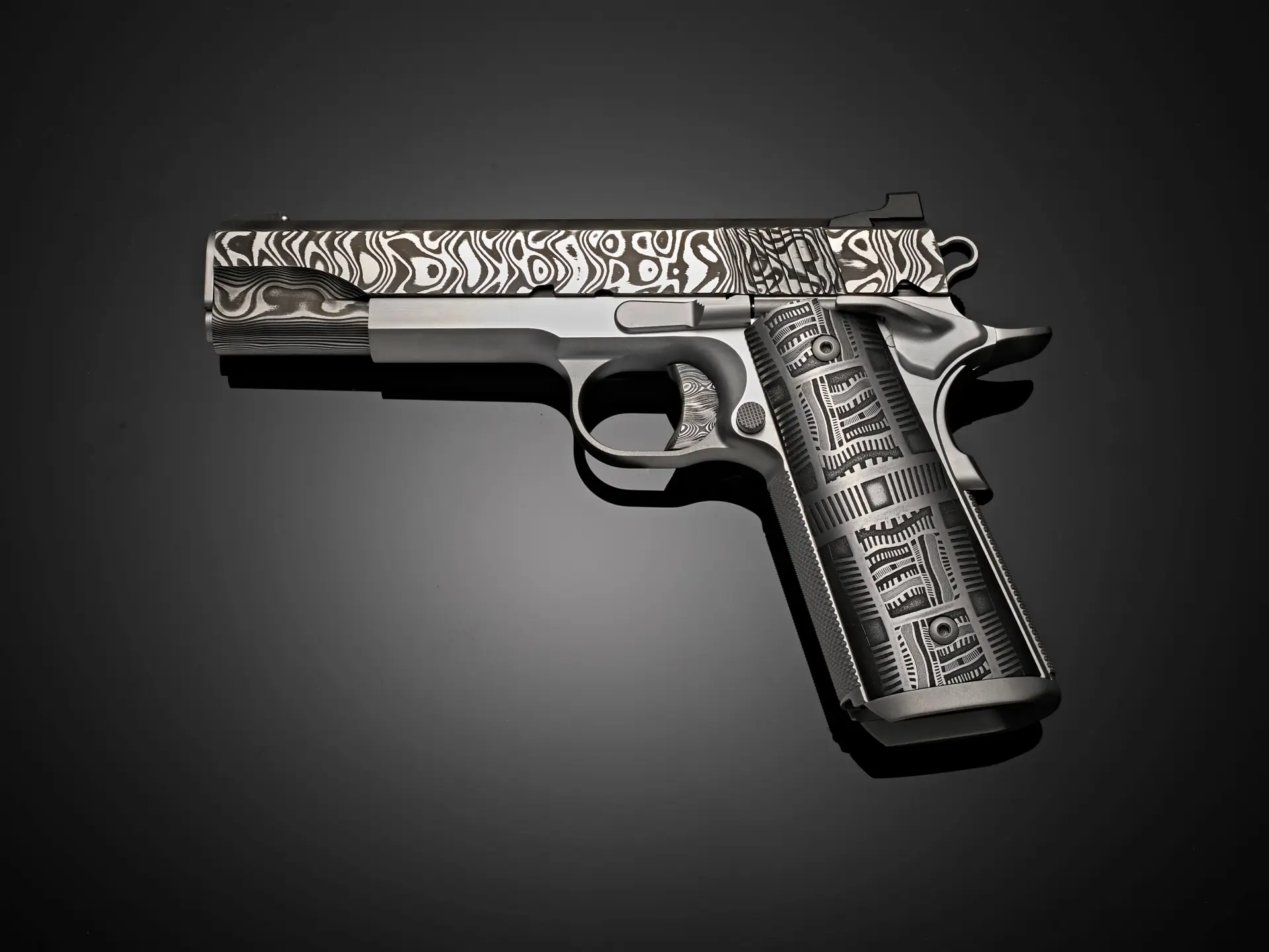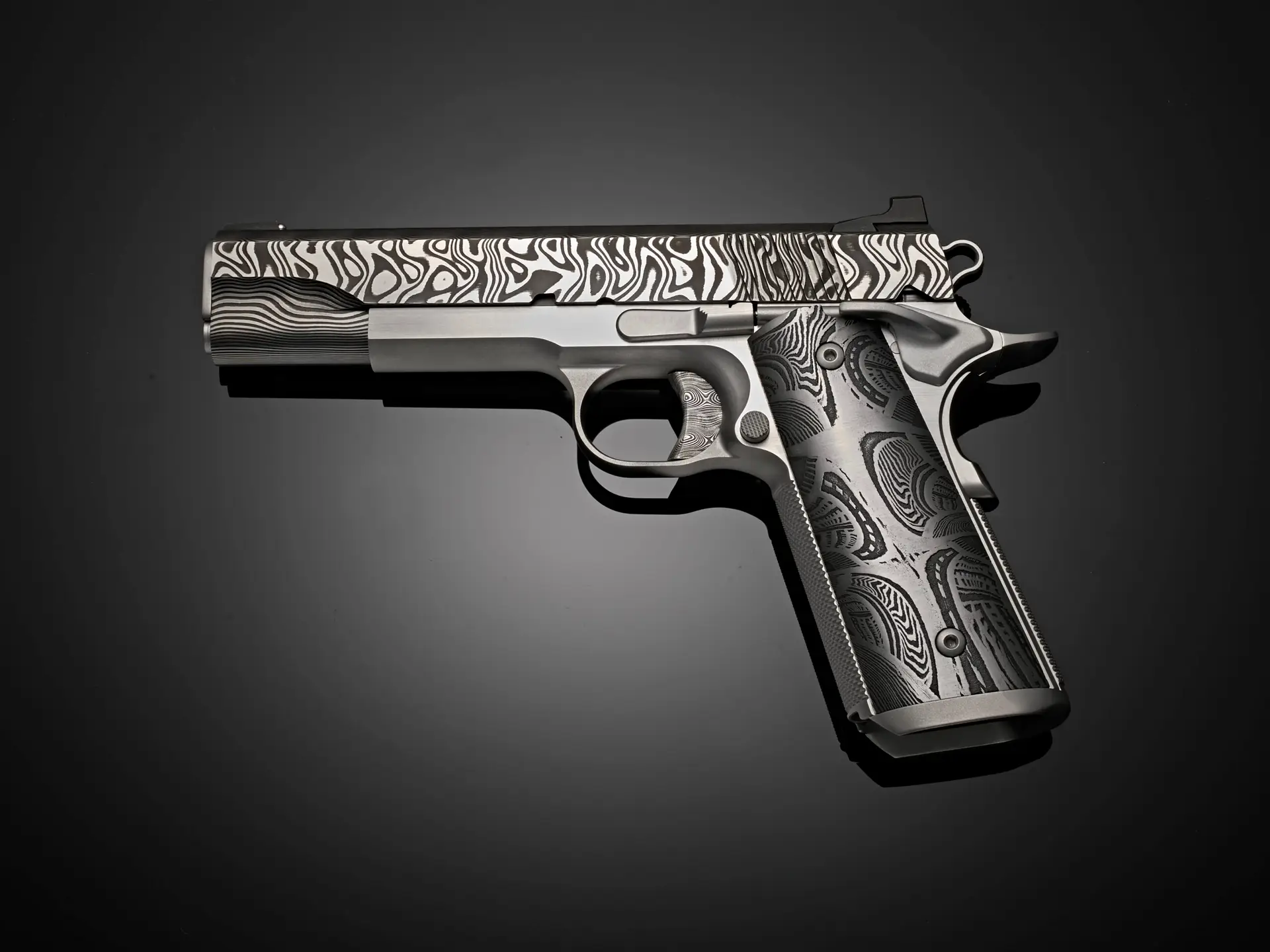 The pattern of the Morrissey Damascus grips on Pisol One of the collection is a balance of order and evolution that defines this 1911. Linear elements establish a framework—strong, deliberate, and grounded—while subtle curves and variations soften the structure from within. The pattern builds in layers, each one contributing to a larger, unified composition that feels both stable and dynamic.