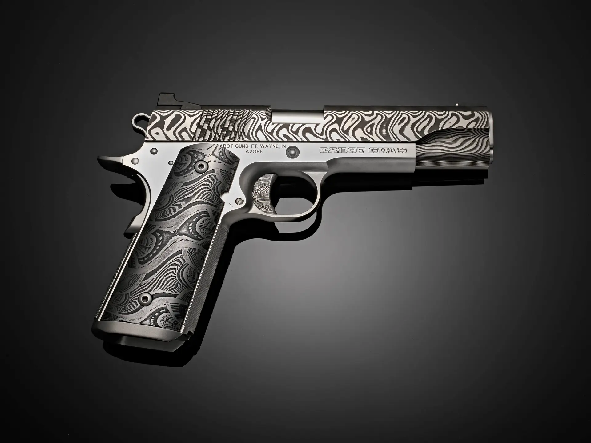 Pistol Five of the collection features Morrissey Damascus grips that feature a damascus pattern that is a return to organic form, this set carries a softer, more fluid expression. Rounded contours and layered waves move across the surface with ease, creating a pattern that feels continuous and unforced. The lines gather and disperse like currents, forming shapes that seem to evolve rather than repeat.