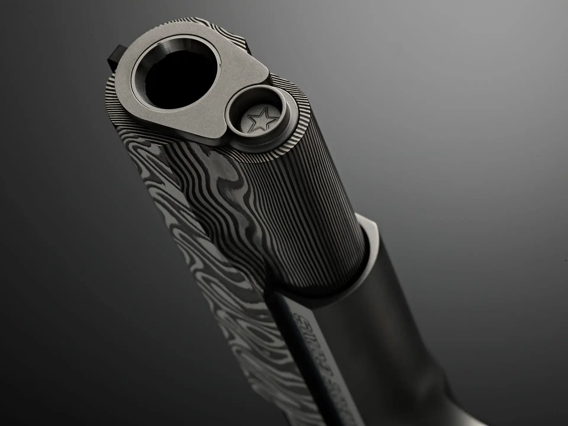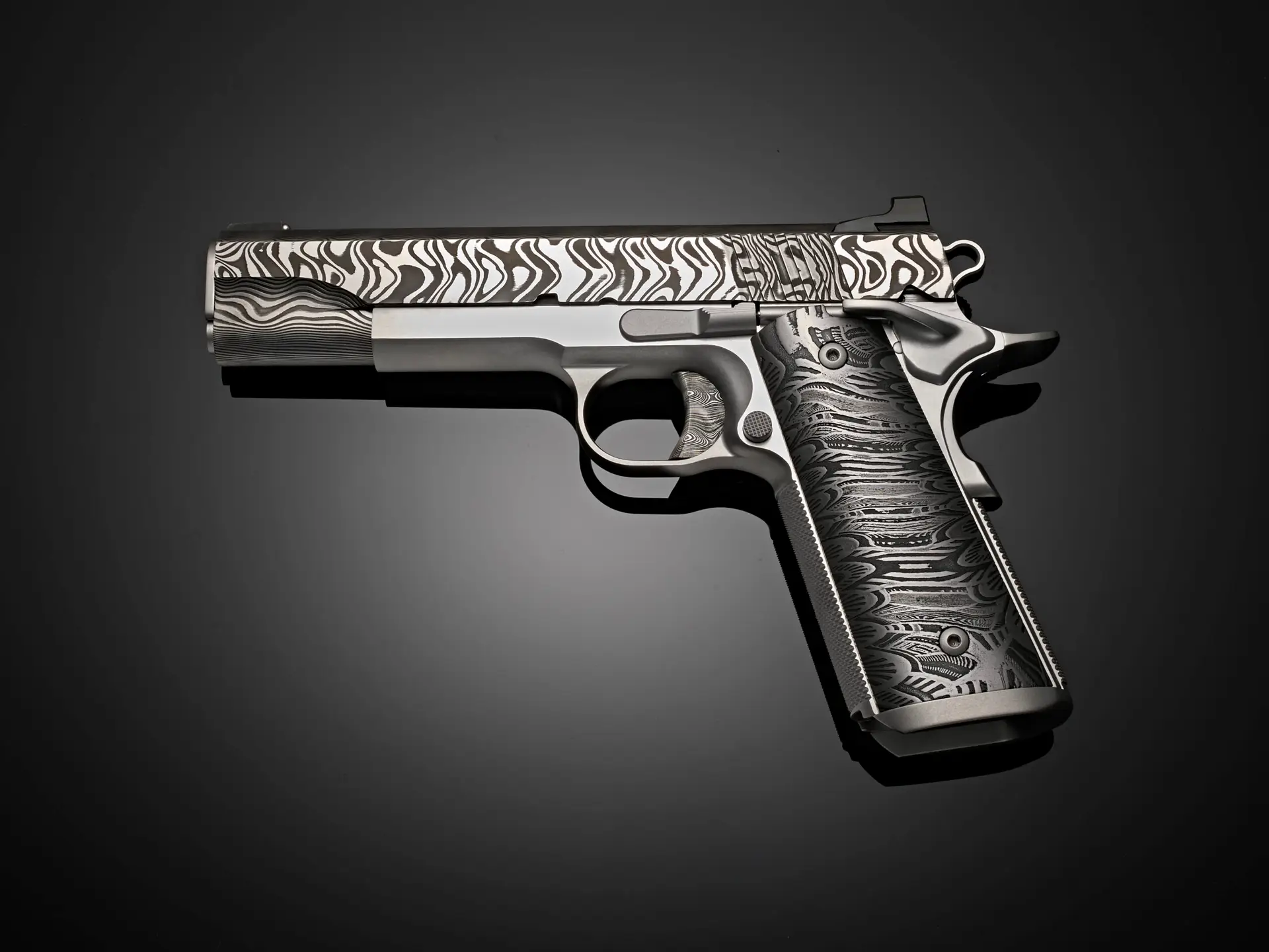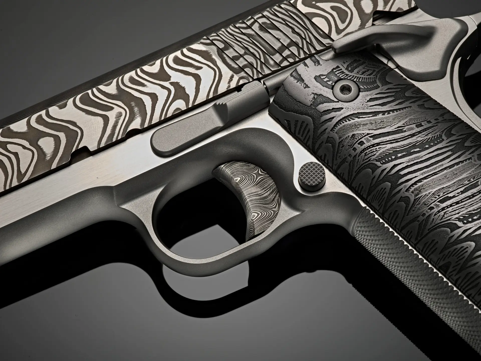 The six pistols showcase slides forged from 120 to 135 layers of stainless Damascus steel, hand-forged by third-generation blacksmiths—the same storied quality that forms the foundation of our Ultimate Carry Pistols. Each Damascus billet is meticulously transformed into a slide in our Cabot machine shop, preserving its crisp, repeating chevron pattern. Elegant as woven twilight and sharp as fishbone and shadow, the pattern awakens under the skilled hands of our gunsmiths through acid-etching and polishing, where the dramatic interplay of dark and light unveils the steel’s full, mesmerizing character.