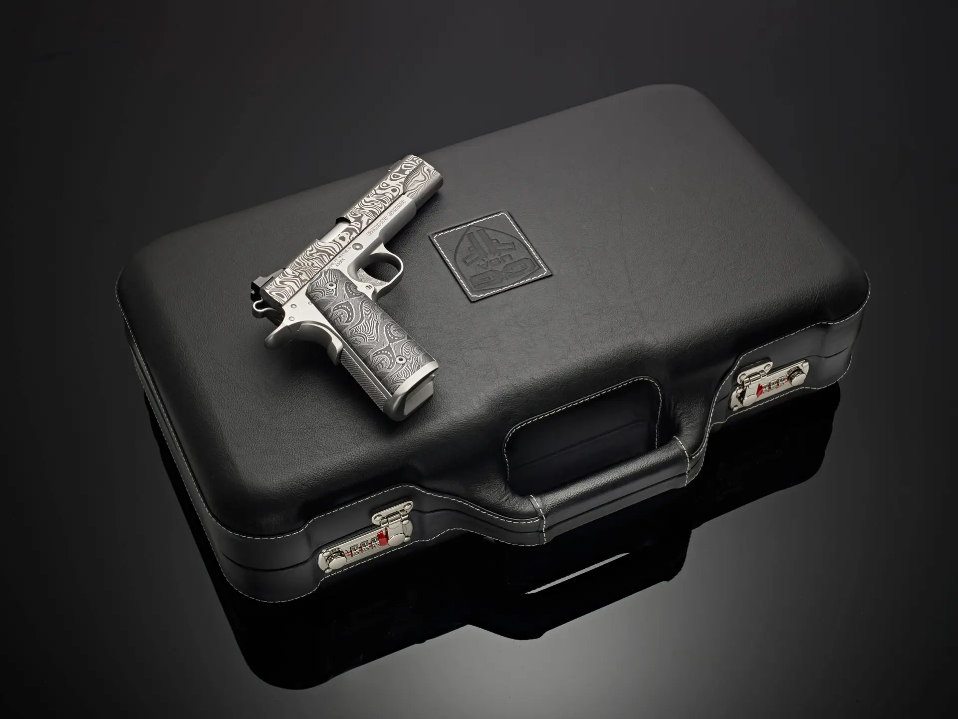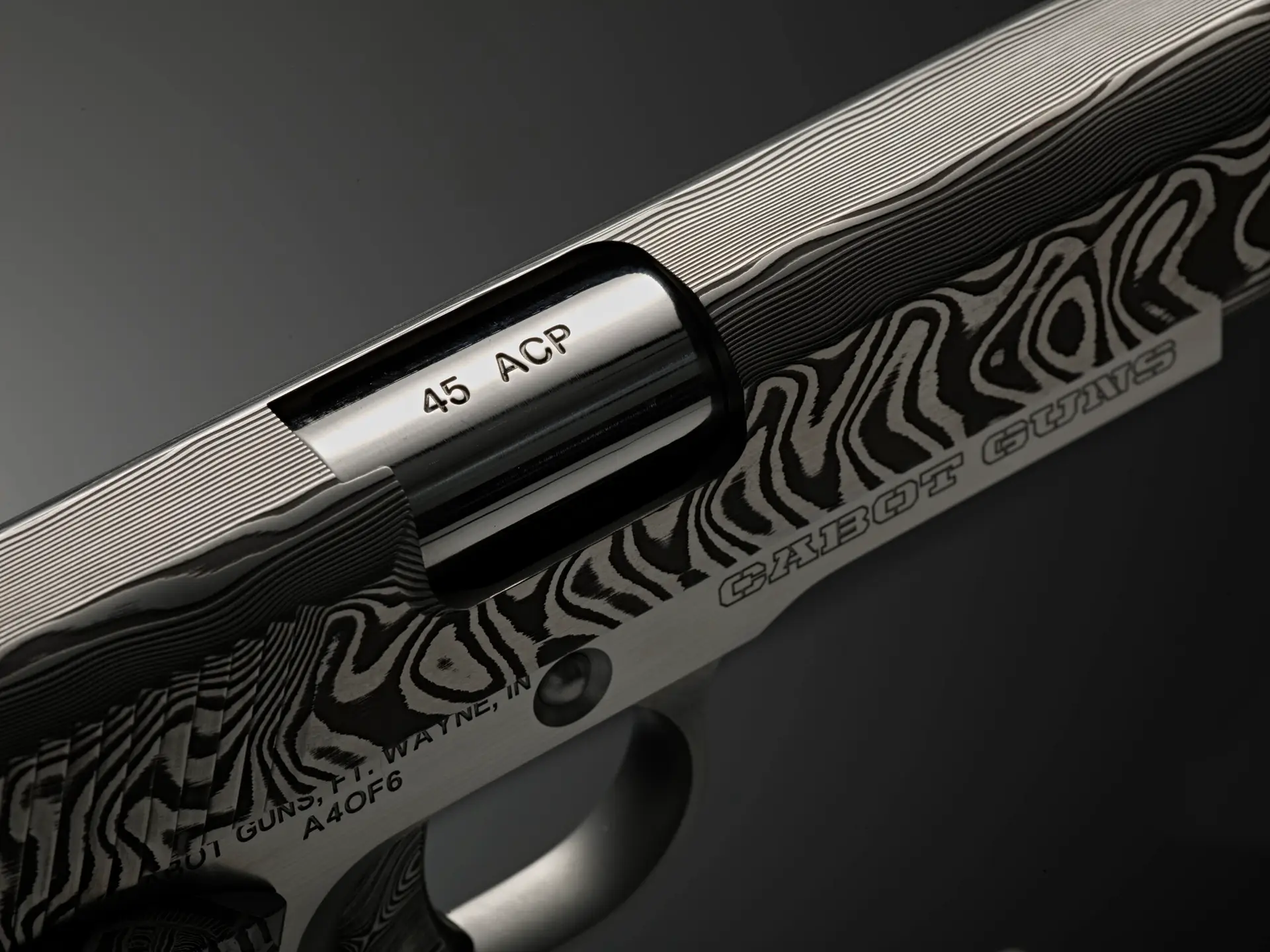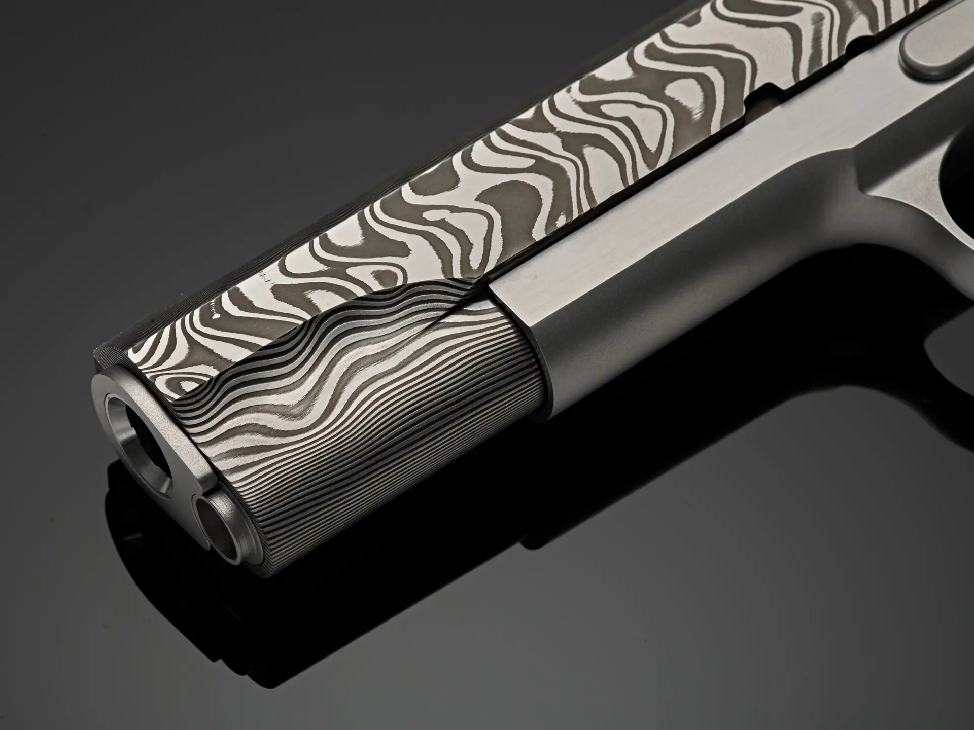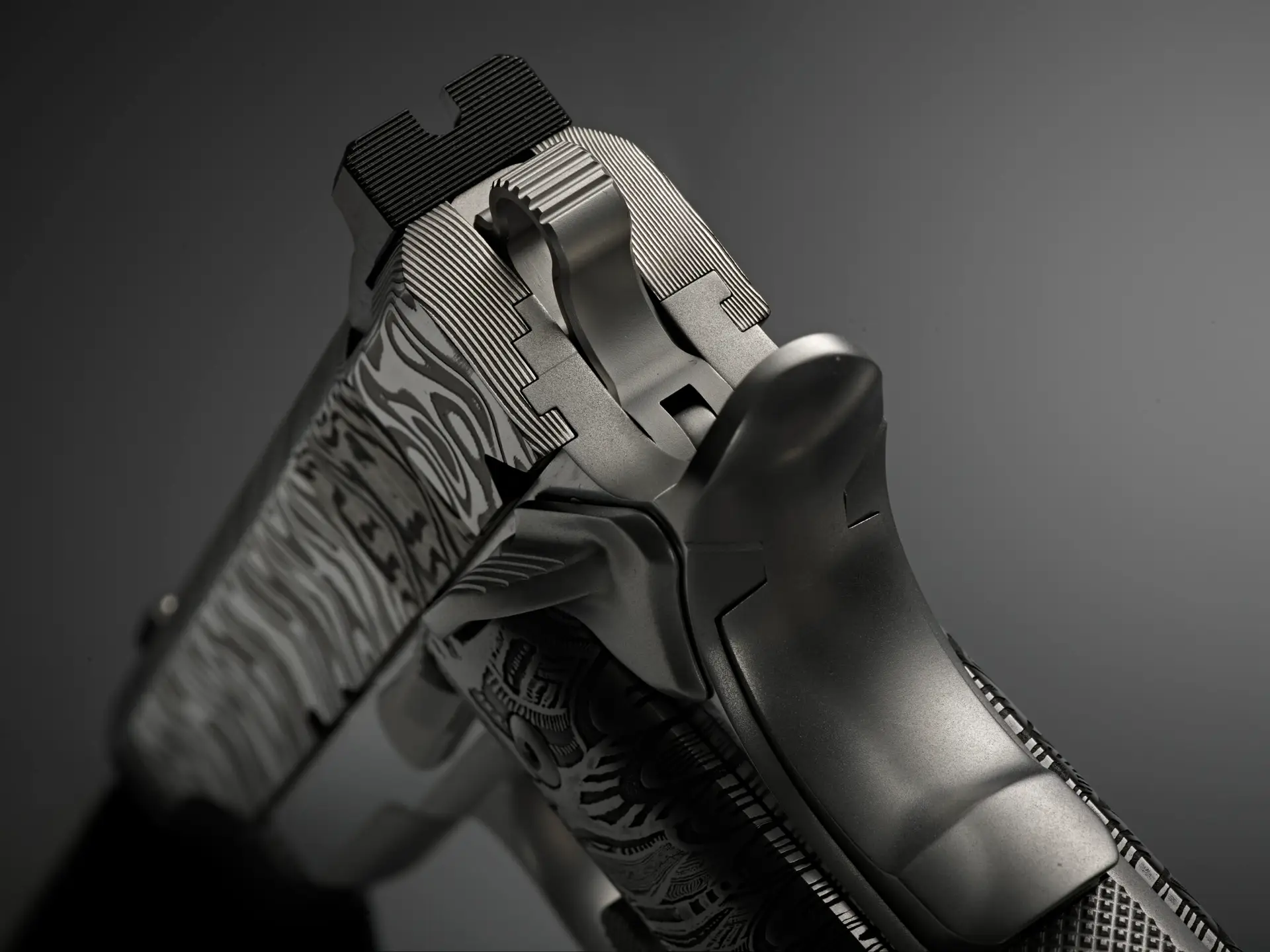 The six pistols showcase slides forged from 120 to 135 layers of stainless Damascus steel, hand-forged by third-generation blacksmiths—the same storied quality that forms the foundation of our Ultimate Carry Pistols. Each Damascus billet is meticulously transformed into a slide in our Cabot machine shop, preserving its crisp, repeating chevron pattern. Elegant as woven twilight and sharp as fishbone and shadow, the pattern awakens under the skilled hands of our gunsmiths through acid-etching and polishing, where the dramatic interplay of dark and light unveils the steel’s full, mesmerizing character.