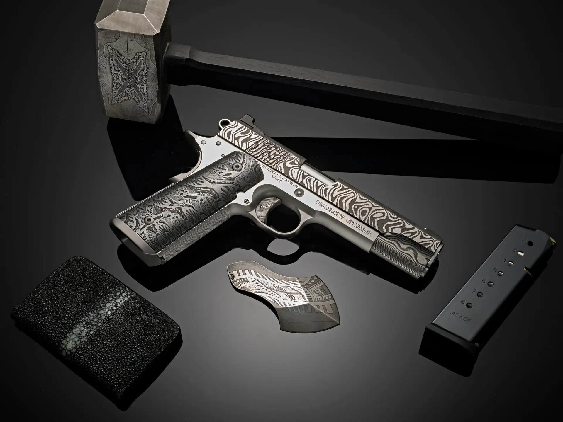 Our collaboration with Jason began many years ago with the Diablo Damascus pistol and has since flowered through one-of-a-kind Masterpieces Magma, Raindrop, St. Michael’s Banderole, and the Gothic Guardian. With every project, we have pursued the highest ideal of the 1911 — not simply as a firearm, but as wearable heirloom art forged from the rarest materials on earth. Each of the six pistols is rendered in the enduring full-åsize Government form, proudly chambered in .45 ACP—a distinctly American pairing of strength, heritage, and time-honored design.
